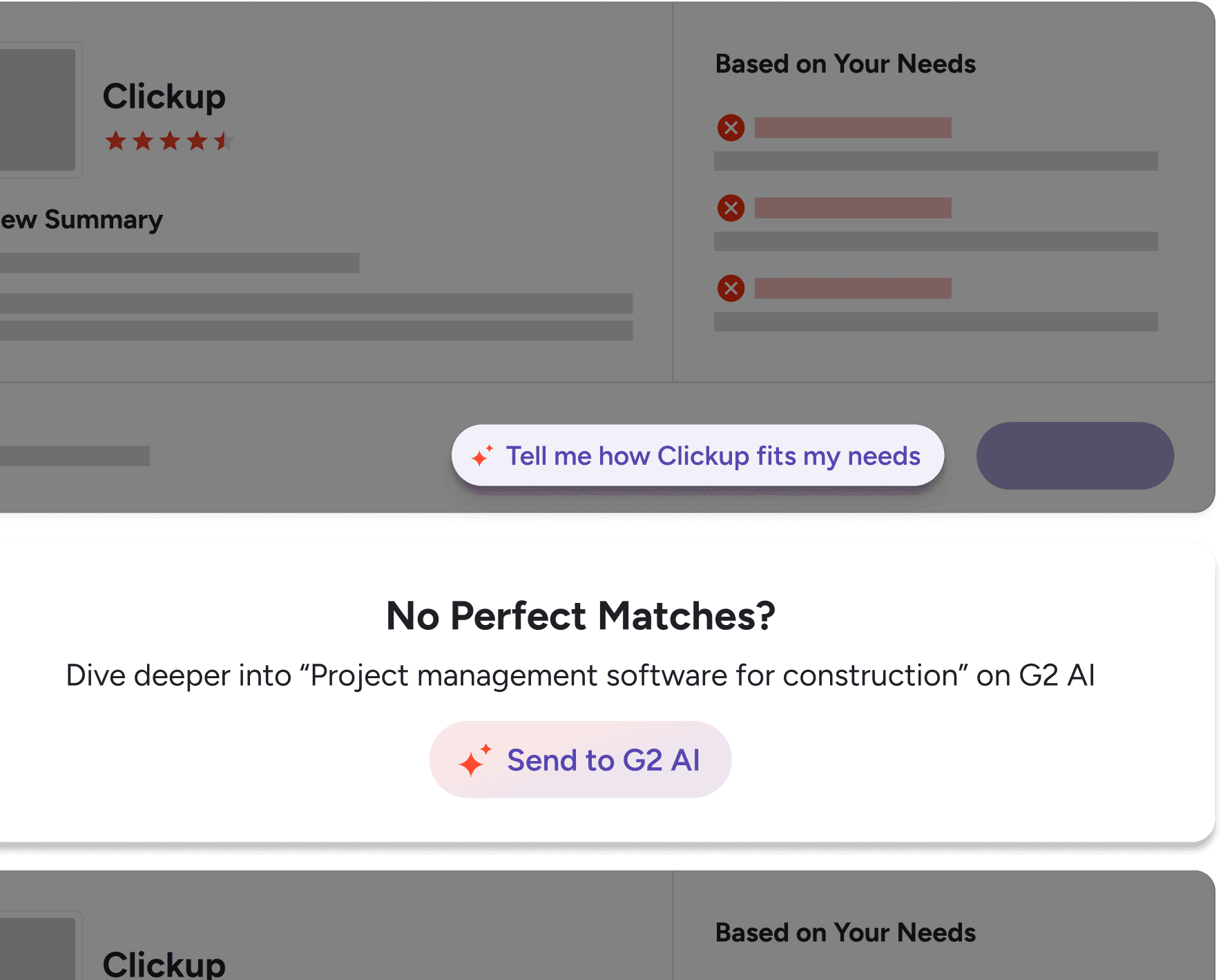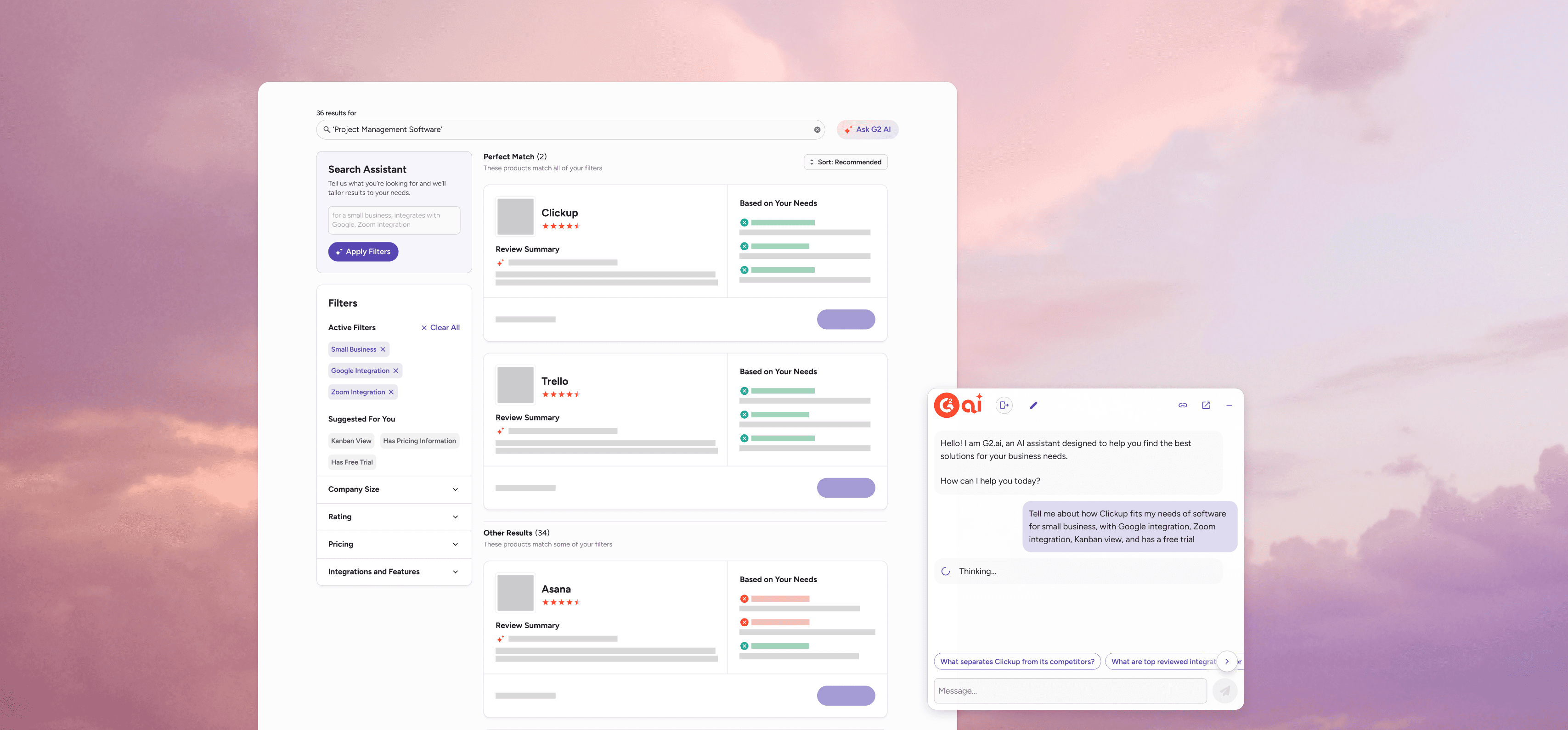 Takes the current search context and applied filters allowing buyers to seamlessly transition their search into G2 AI.