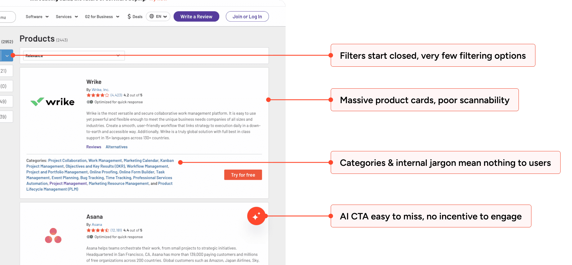 When software buyers on G2.com struggle to find relevant products, they drop off without engaging.