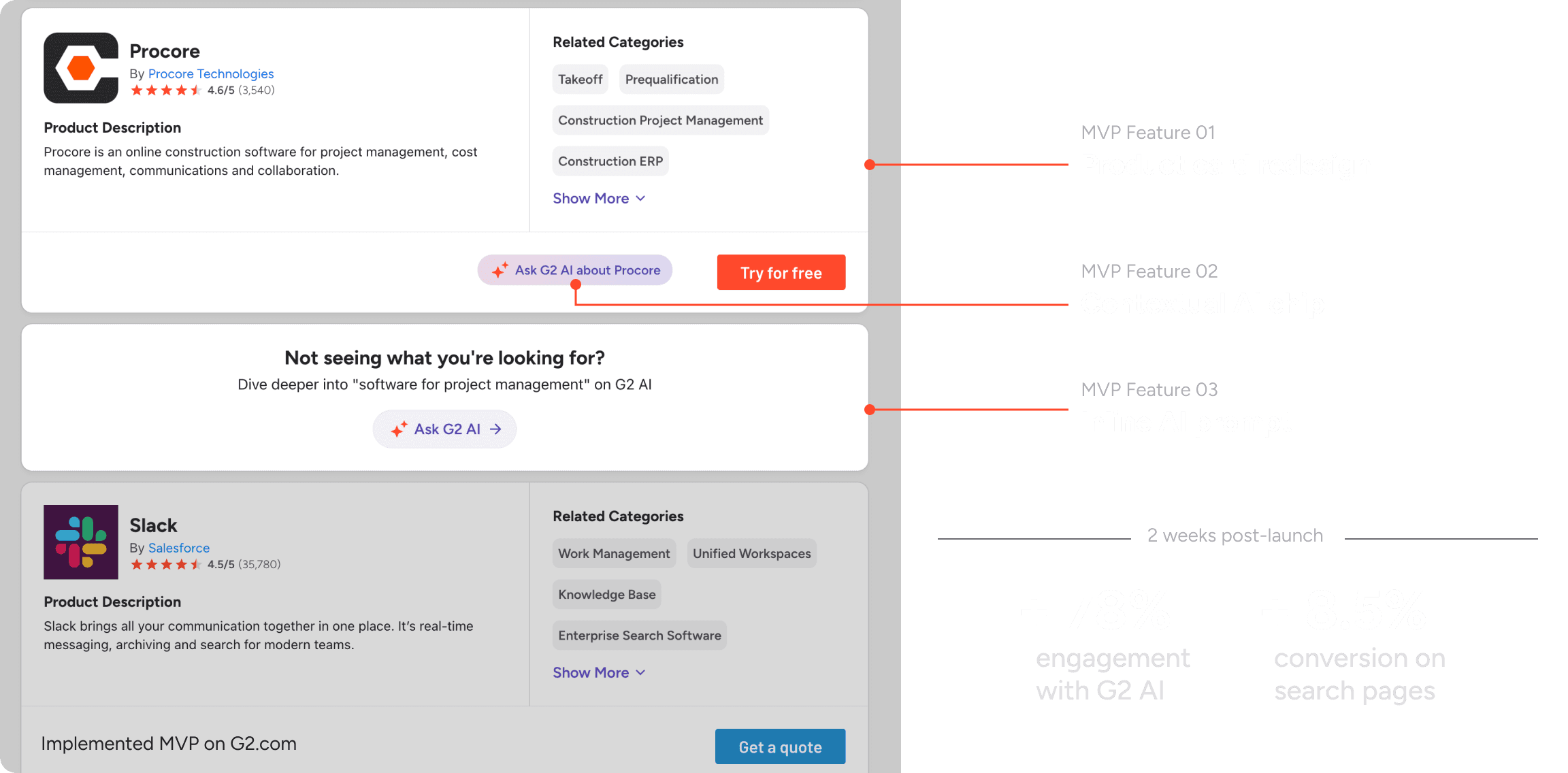 This work performed well in usability testing and with real users after the MVP launch, establishing contextual AI design patterns across the site and advancing G2’s shift to an AI-first company strategy.